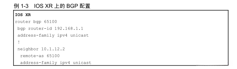 例 1-3 在示例中描述了 R1 运行 IOS XR 操作系统并呈现了其配置信息。技术人员手动配置了 R1 的 RID 设置,由于 R1 设备上并未预先设置任何环回接口。