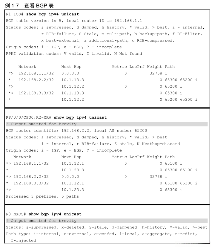 例 1-7 列出了 IOS 系列设备上的 BGP 配置示例;该表包含了来自外部网络接收的路由信息以及本地生成的路由数据。