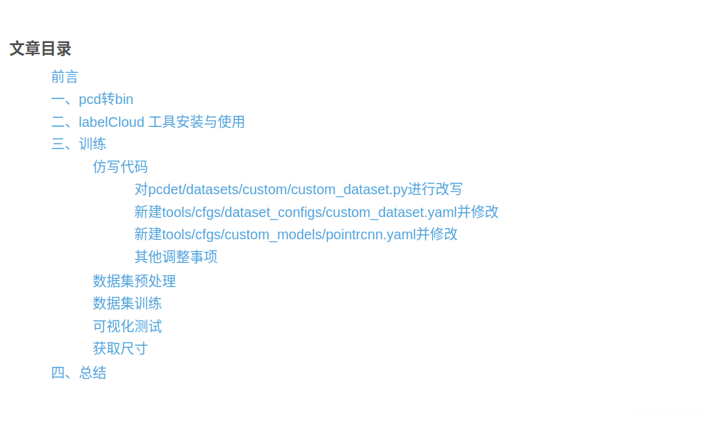 这些天一直在尝试通过OpenPCDet平台训练自己的数据集(非kitti格式),好在最后终于跑通了,特此记录一下训练过程