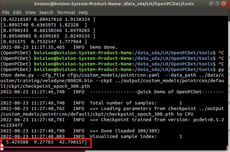python demo.py --cfg_file cfgs/custom_models/pointrcnn.yaml --data_path ../data/custom/testinging/velodyne/ --ckpt ../output/custom_models/pointrcnn/default/ckpt/checkpoint_epoch_300.pth
