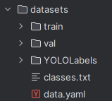 图片数据的存放格式如下,在项目目录中新建datasets目录,同时将检测的图片分为训练集与验证集放入datasets目录下。