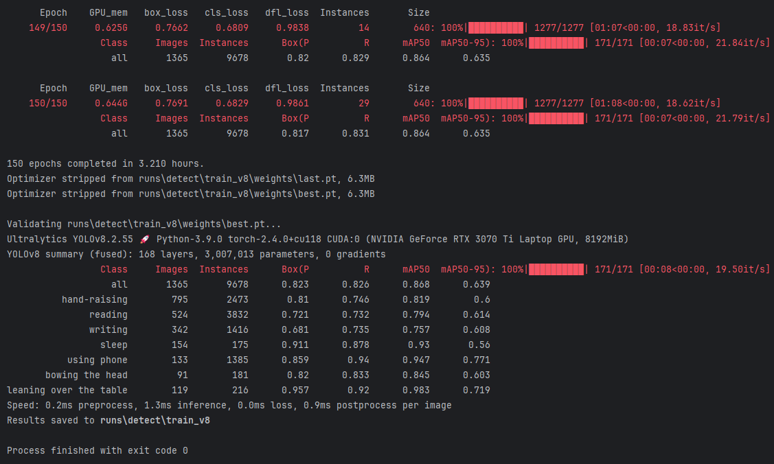 该验证结果表明模型在不同学生专注度类别上的检测精度和召回率表现较好,尤其是在”leaning over the table”和”using phone”这些类别中表现突出,但在”sleep”和”writing”这些类别中表现稍差。模型总体检测效果较为理想,且推理速度较快,适合实时检测应用场景。