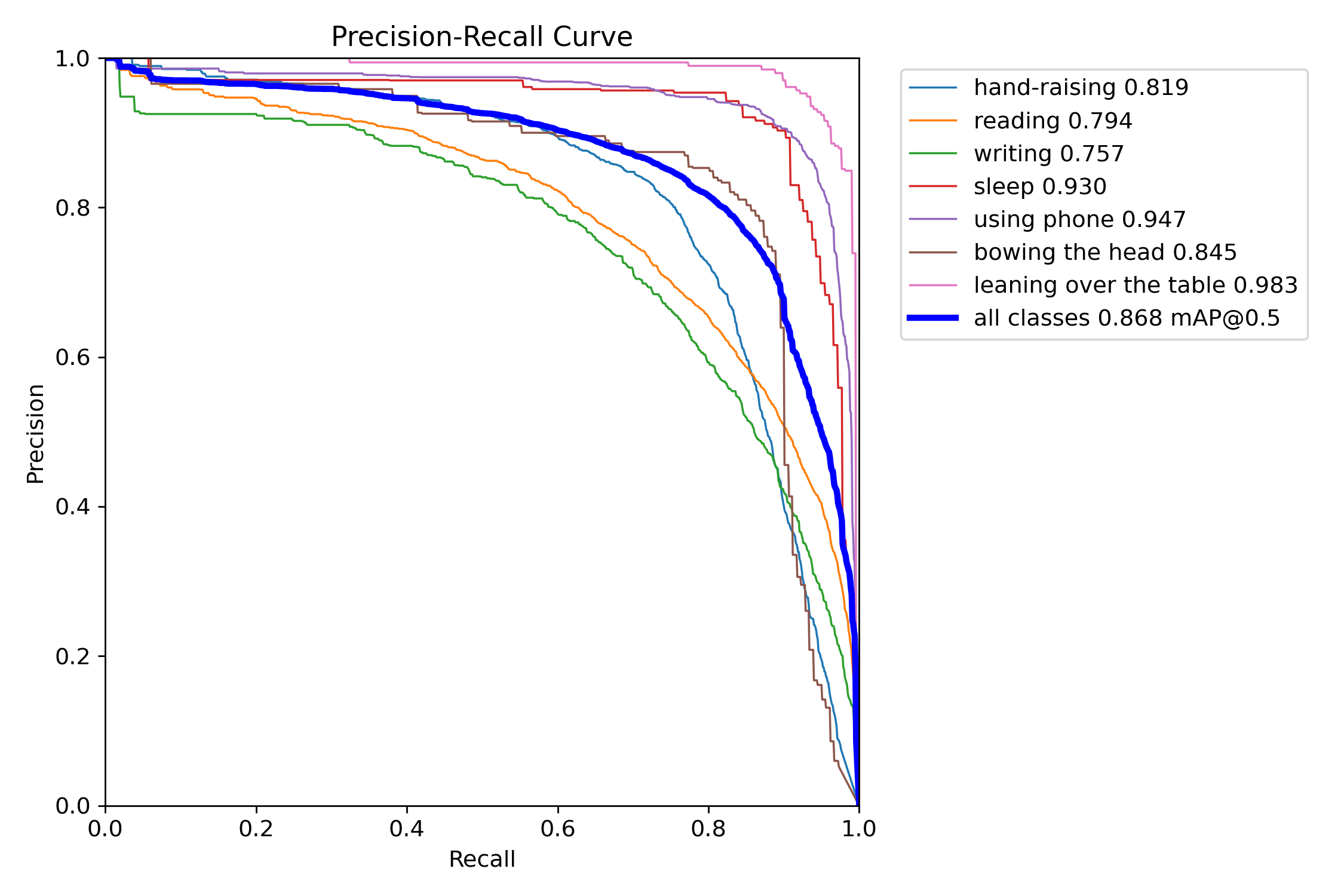 names: [‘hand-raising’, ‘reading’, ‘writing’, ‘sleep’, ‘using phone’, ‘bowing the head’, ‘leaning over the table’]