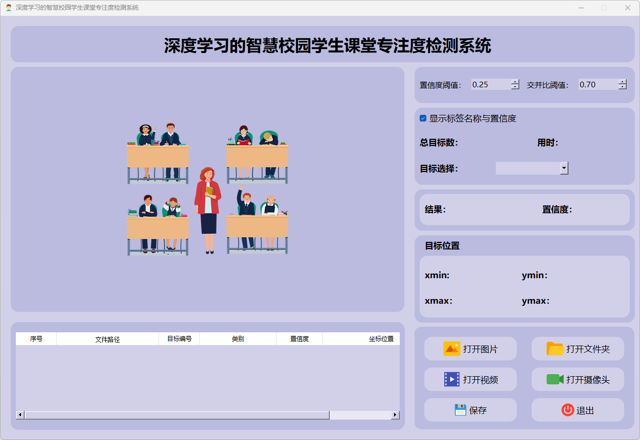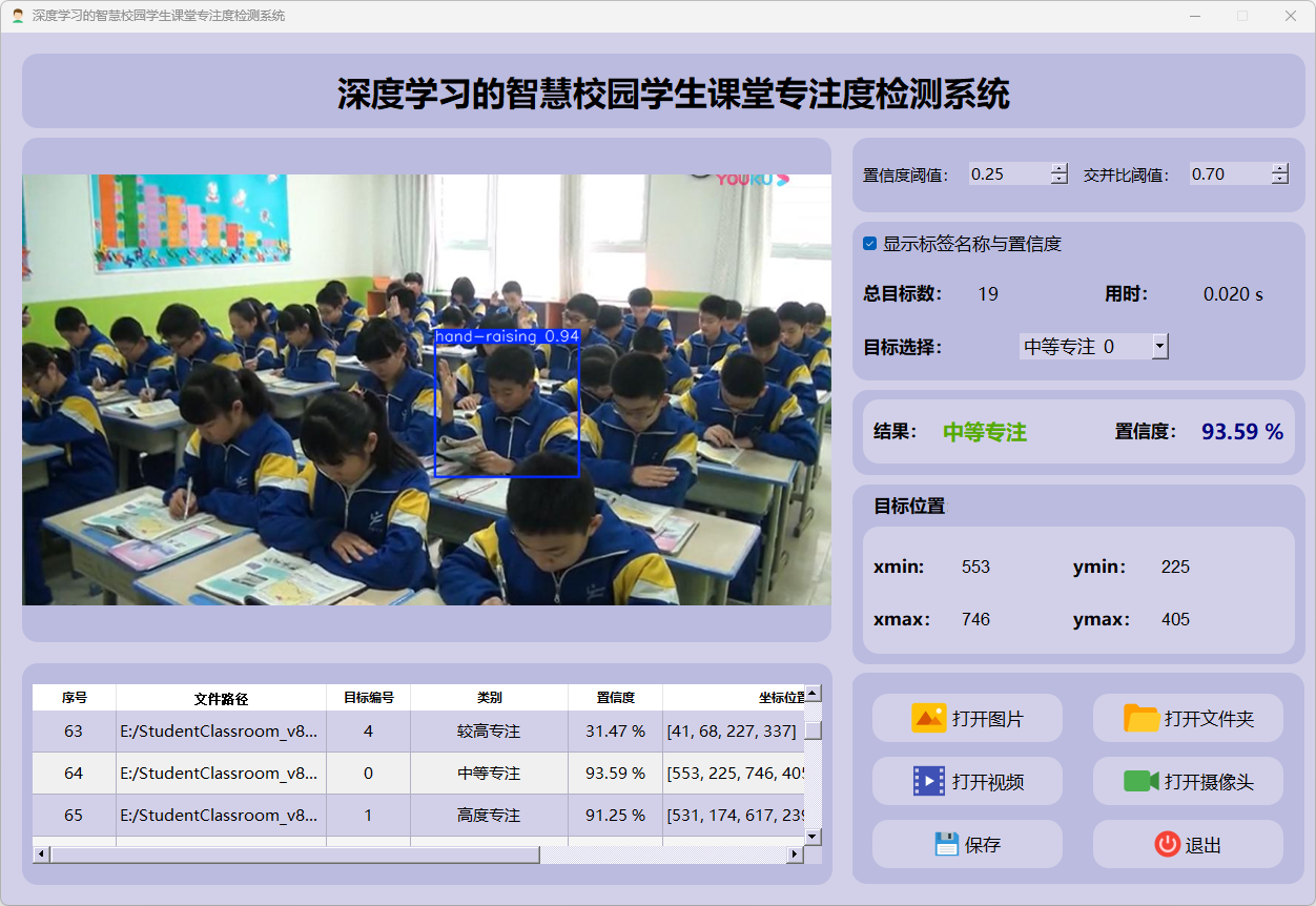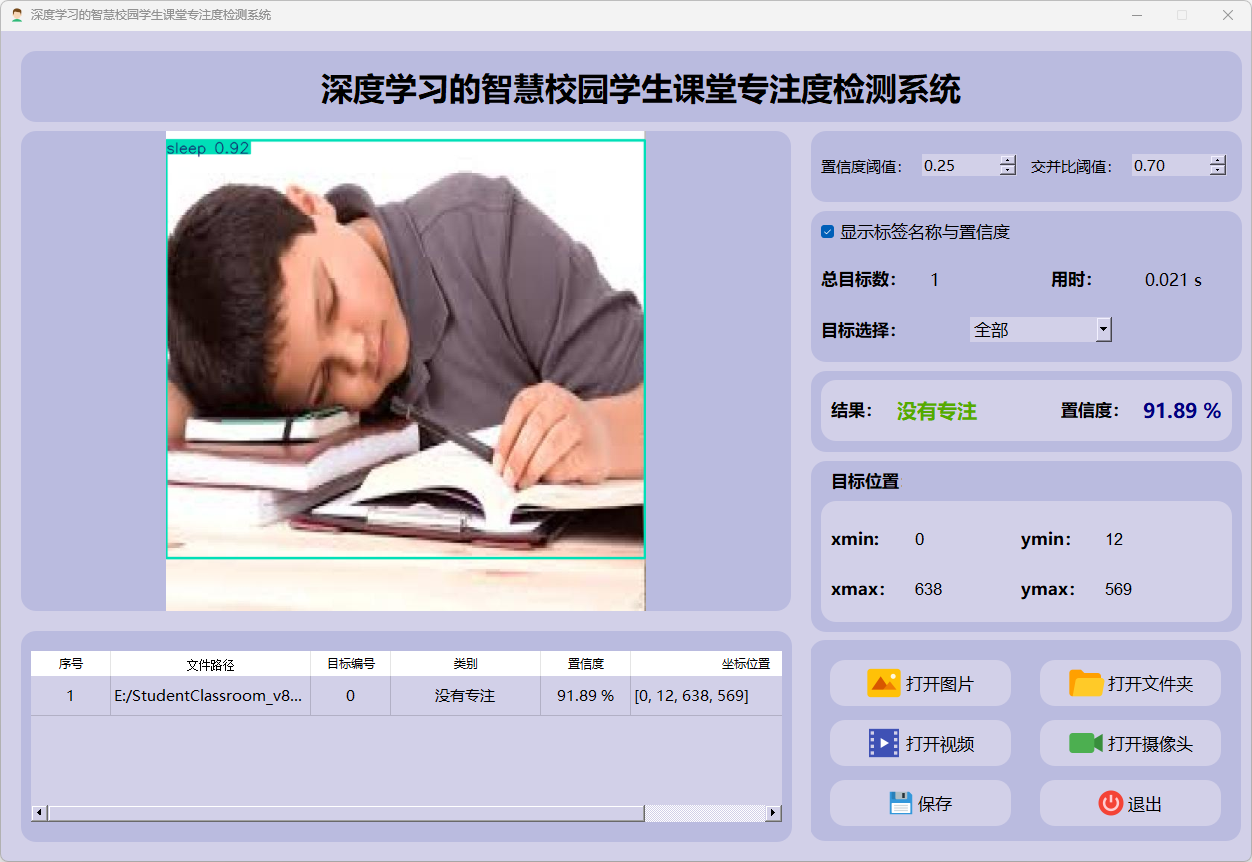 检测结果:系统识别出图片中的学生专注度,并显示检测结果,包括总目标数、用时、目标类型、置信度、以及目标的位置坐标信息。