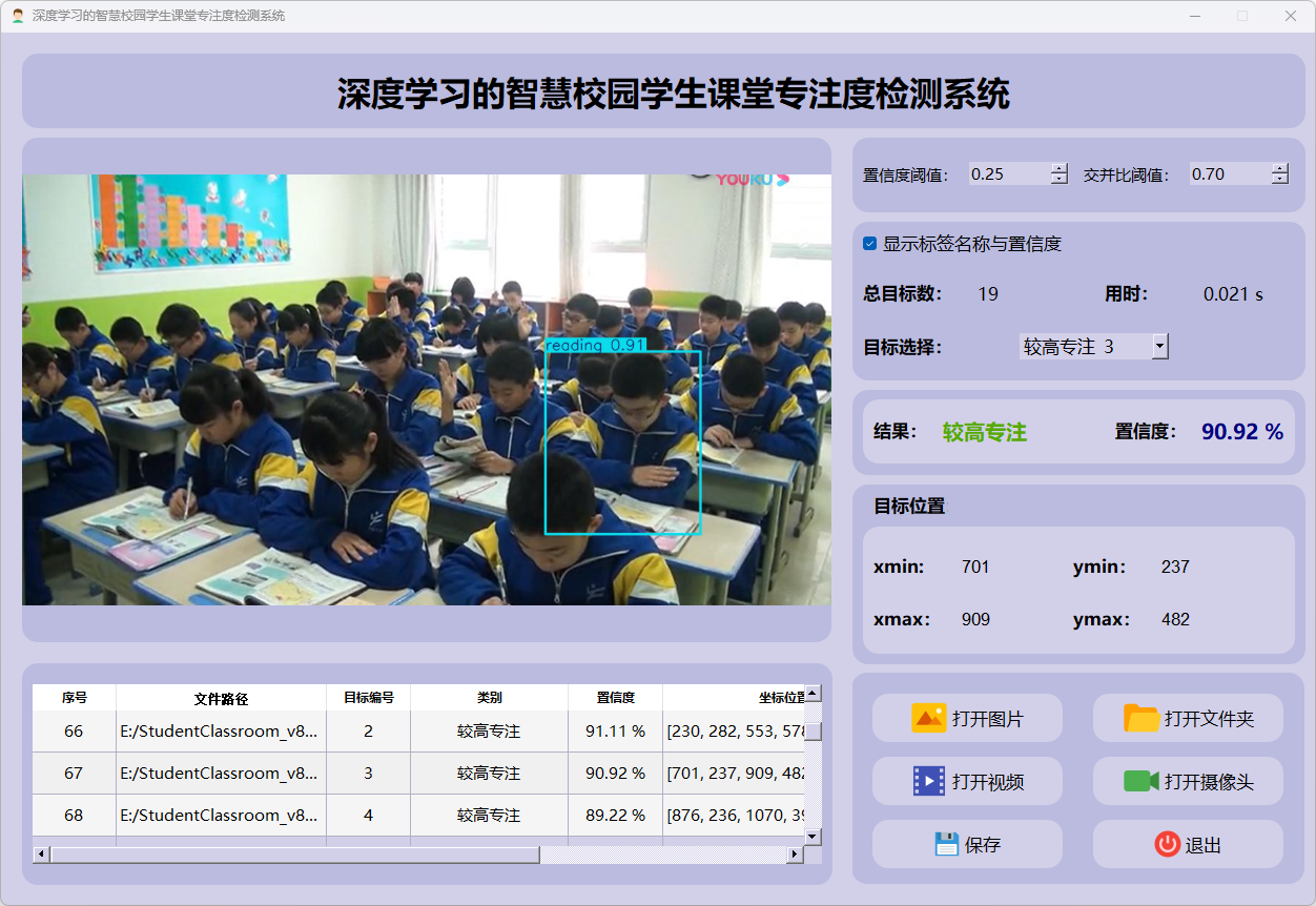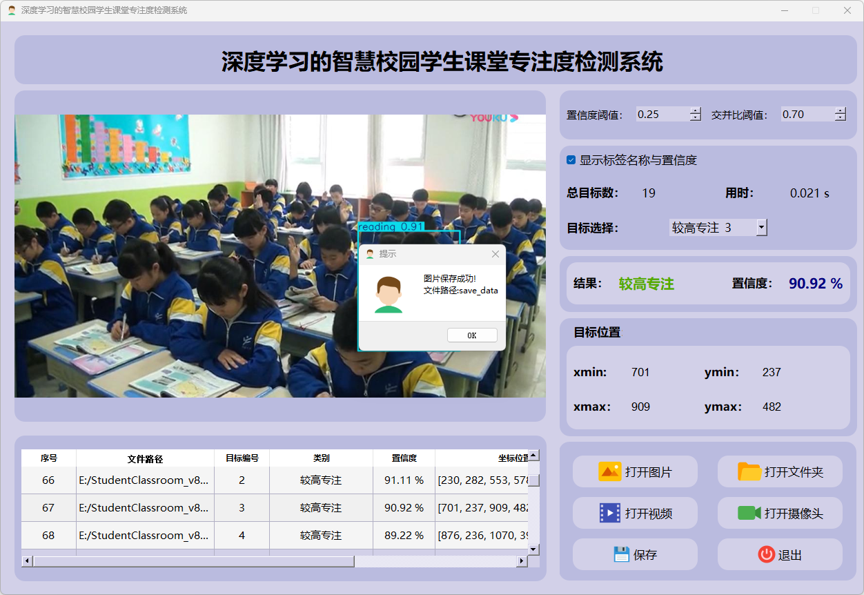 这个界面展示了系统对视频帧中的多目标检测能力,能够准确识别学生专注度,并提供详细的检测结果和置信度评分。
