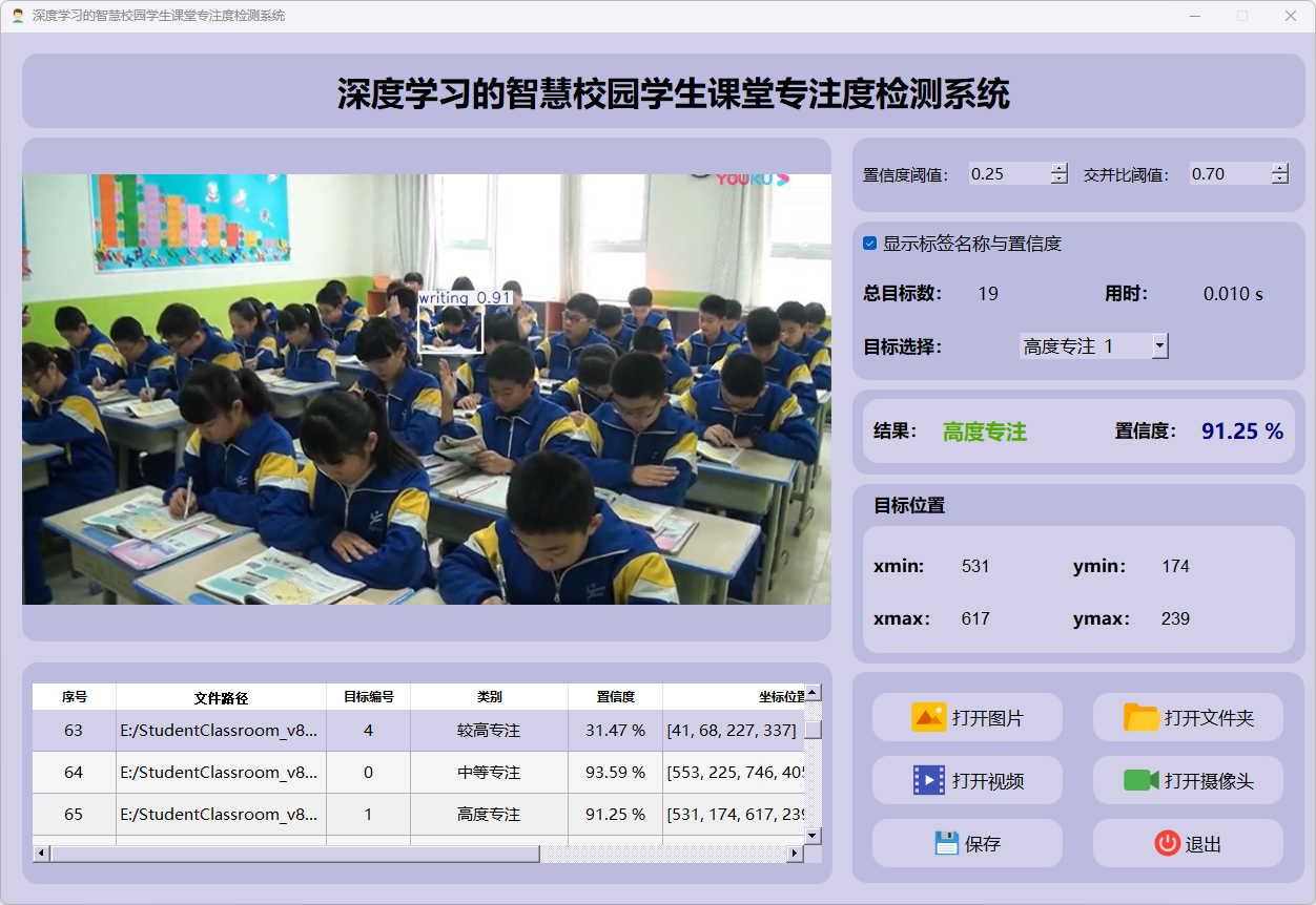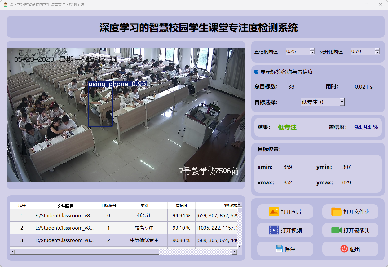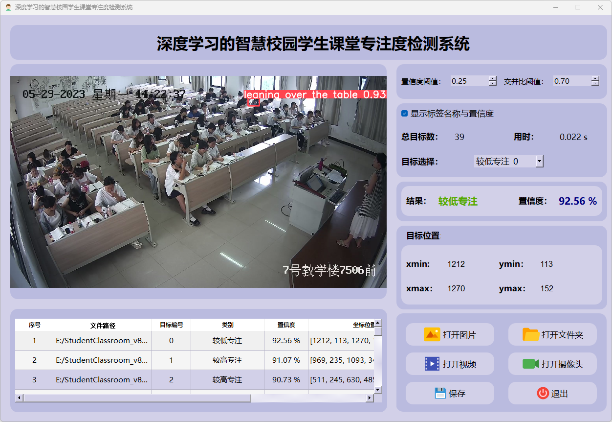 检测结果:系统对视频进行实时分析,检测到学生专注度并显示检测结果。表格显示了视频中多个检测结果的置信度和位置信息。