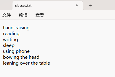 存放标签类别的文件的文件名为classes.txt (固定不变),用于存放创建的标签类别。