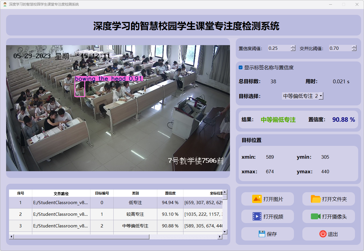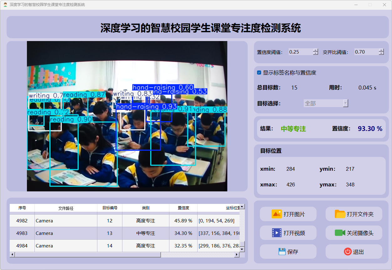 检测结果:系统连接摄像头进行实时分析,检测到学生专注度并显示检测结果。实时显示摄像头画面,并将检测到的行为位置标注在图像上,表格下方记录了每一帧中检测结果的详细信息。