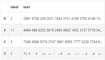 数据为新闻文本,已按照字符级别进行脱敏处理。数据集中一共有14个类别,对应关系为:{‘科技’: 0, ‘股票’: 1, ‘体育’: 2, ‘娱乐’: 3, ‘时政’: 4, ‘社会’: 5, ‘教育’: 6, ‘财经’: 7, ‘家居’: 8, ‘游戏’: 9, ‘房产’: 10, ‘时尚’: 11, ‘彩票’: 12, ‘星座’: 13}。训练集20w条样本,测试集A包括5w条样本,测试集B(用于网站模型评估, 不提供下载)包括5w条样本。训练集只有"label"和"text"两列,数据格式如下: