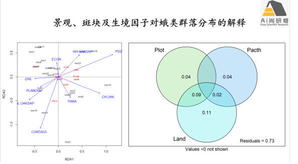2) 案例1中的景观斑块特征及其所处生境因子对蛾类群落空间格局变化特征分析:采用RDA dbRDA或CCA等方法进行建模,并结合变差分解技术评估各模型的解释力