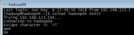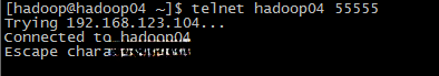 然后再复制hadoop04节点连接会话,输入telnet hadoop04 55555