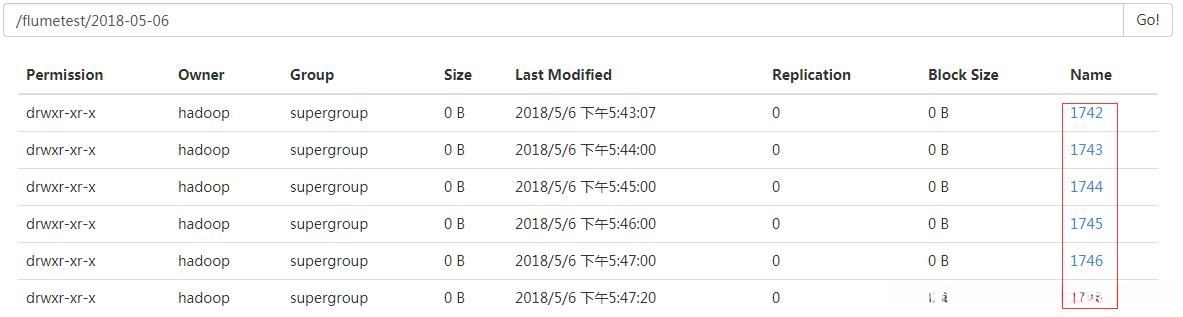 flume将在执行写操作前的准备阶段持续不断地将数据存储到其指定的HDFS存储位置(即flumetest文件夹)中。