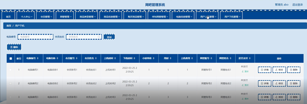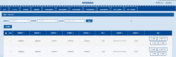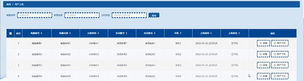 在用户上机管理界面中可以看到标识号(索引)、设备ID(电脑编号)、设备名称(电脑名称)、每小时费用(小时单价)、会员账号(会员账号)、手机绑定信息(手机)、登录时间和离线状态等详细信息,并支持详细信息查看功能(详情)、设备离线处理流程(用户下机)、设备信息维护模块(修改和删除操作)。如图1-10所示。