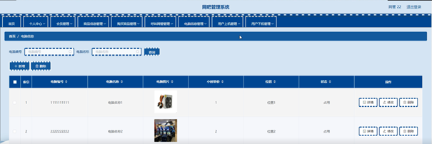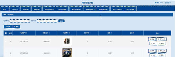 在电脑信息管理界面中,在线查看索引、账号、名称、图片等基础信息,并支持详情查看、用户上机操作以及修改、删除功能;如图1-9所示。