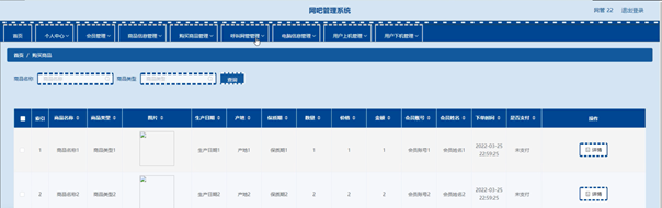 在商品信息管理模块中提供全面的商品数据展示及操作功能:允许用户浏览商品列表并获取详细信息包括但不仅限于:产品索引号、产品名称、产品种类分类、图片信息资料等基础数据项以及生产日期记录产地标识等关键参数;支持完成订单创建的基本流程即浏览所需商品后可直接进入下单确认阶段并完成支付操作流程以及订单状态查询等功能如图1-7所示