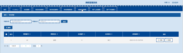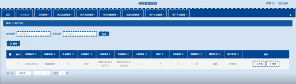在用户的下机管理界面里可以查询到索引、电脑编号、设备名称、会员账号以及账号 holder 姓名等信息,并可对设备信息执行详情浏览及删除操作;如图 1-17 所示