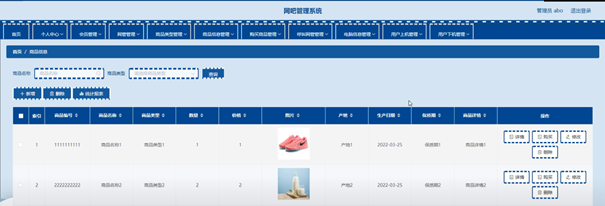 在商品信息管理页面中浏览商品列表并查看以下详细信息:产品编号、产品名称、产品类别、图片展示、生产日期、发货地点、质量保证期、库存数量、销售价格、支付金额、登录账号、用户姓名、订单提交时间以及订单状态等信息内容。具体信息可参考图1-13。