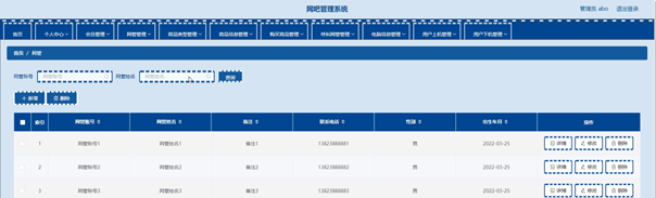 网络管理模块;在网管管理页面中实时查看索引、网管账号、网管姓名、备注信息、联系电话、性别资料以及出生年月等内容,并支持详情查看、信息修改及记录删除操作;如图1-4所示。