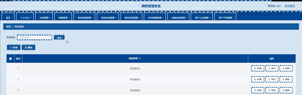 在商品类型管理模块中,在商品类型管理页面中可以浏览商品库中的各项信息列表,并提供对这些信息的具体操作功能包括详细信息查看、批量修改以及记录删除操作。如图1-5所示的界面展示了相关功能细节。