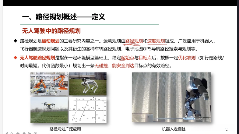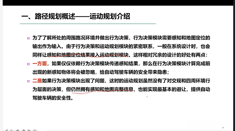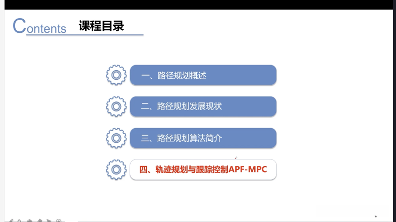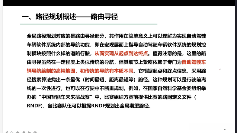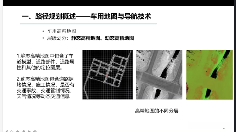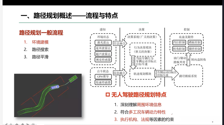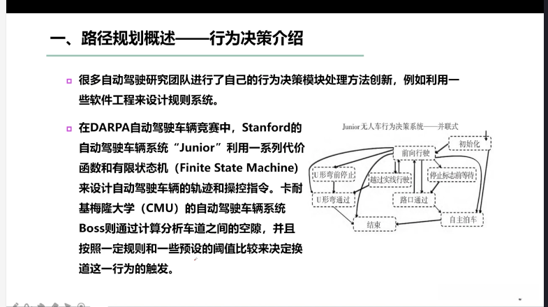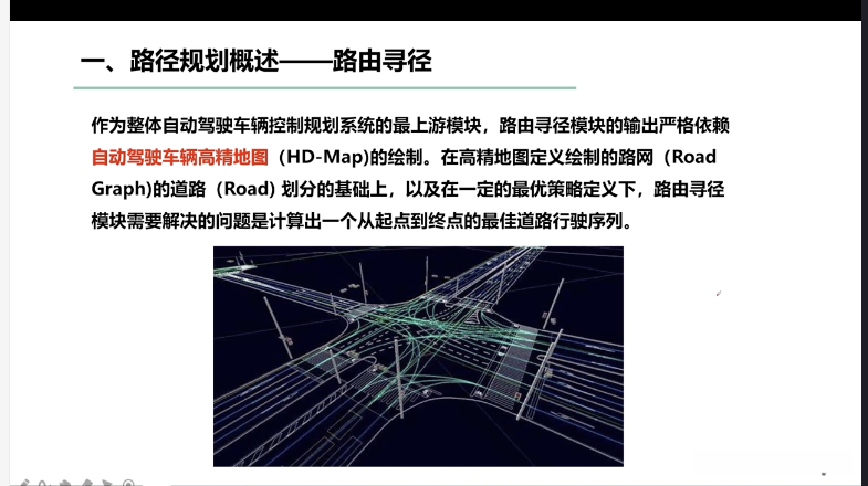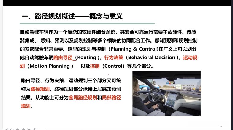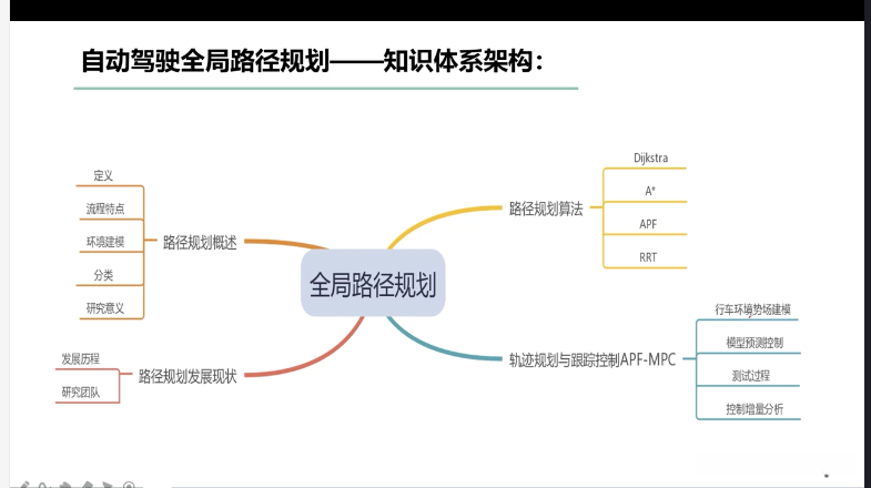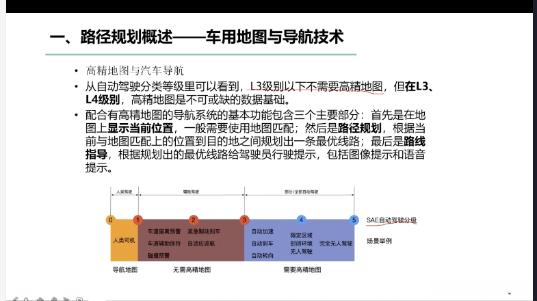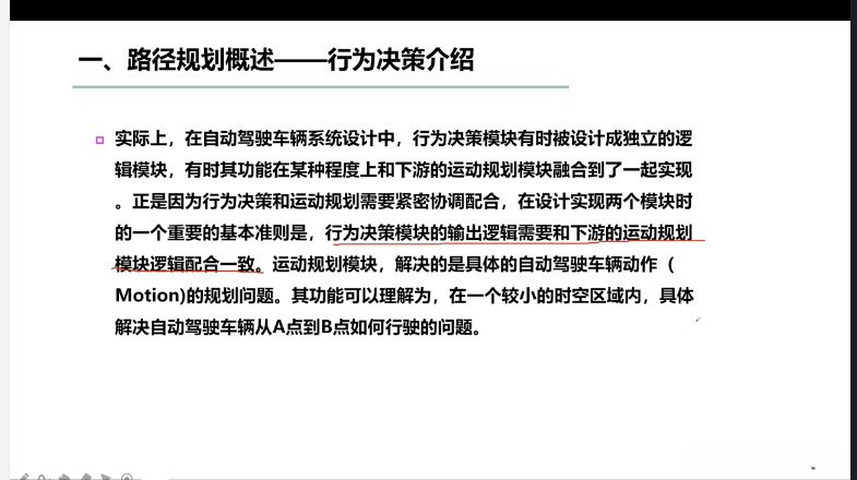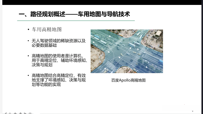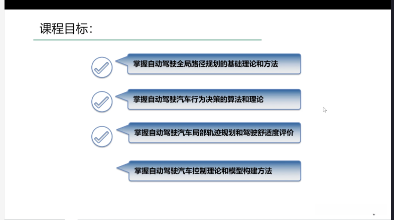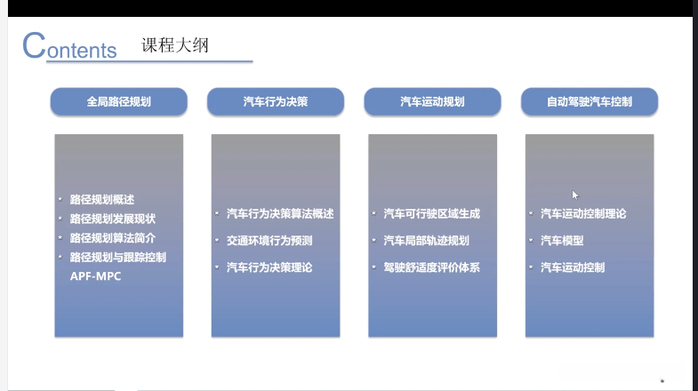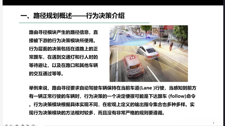 本课程全面讲解了自动驾驶汽车决策与控制技术的相关知识体系,在教学安排上涵盖了以下具体内容:包括全局道路规划方案的设计思路、行为决策模块的具体实现方法以及运动轨迹规划的技术要点。此外还详细介绍了基于Apollo平台的高级别自动驾驶控制系统的设计方案及其在实际场景中的应用效果等。
