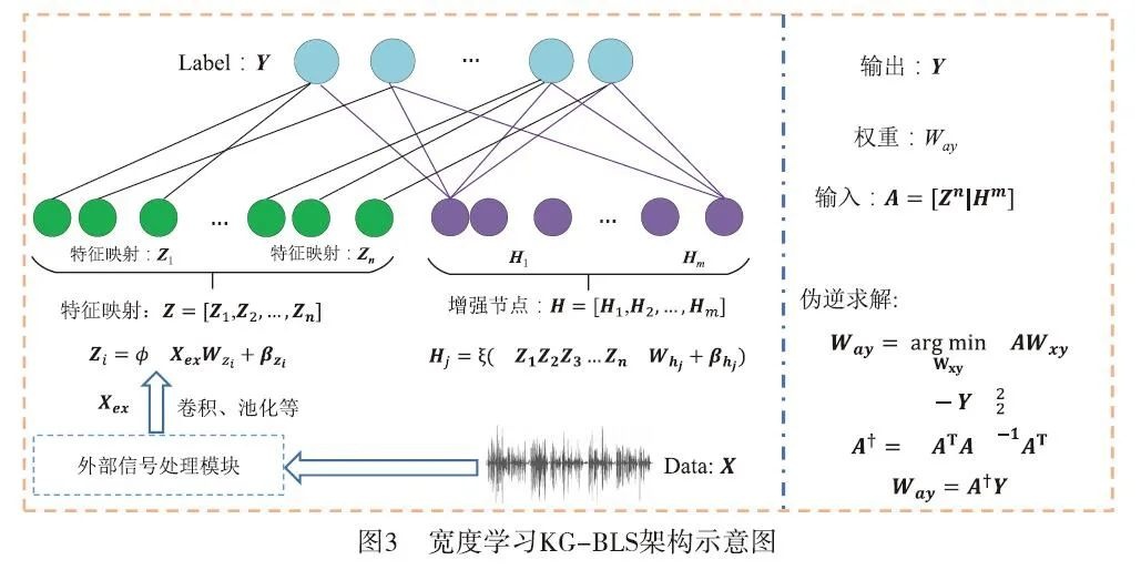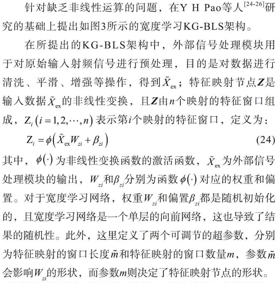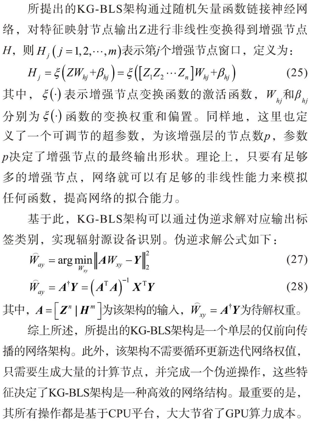 现有的大多数SEI算法均建立在ML算法框架之上;然而,在处理大规模训练样本时传统SVM算法仍会占用大量机器内存并耗时较长。鉴于此,在本文中我们将探索使用宽度学习架构替代现有ML方法来进行辐射源设备识别工作;在本节中介绍所提出的KG-BLS架构SEI算法的具体实现过程包括输入到KG-BLS架构中的信号特征提取、特征映射节点的设计、增强机制的应用以及最终输出用于识别目标结果的过程。