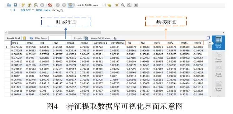 为了进一步实施数据共享策略, 确保数据集的有效控制措施得以完成, 将处理后的数据导入至MySQL数据库环境, 并使用MySQL Workbench平台对提取的特征进行可视化展示, 从而使得后续的数据增删改操作更加便捷, 如图4所示
