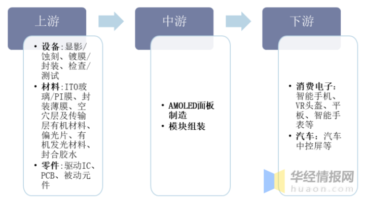 AMOLED产业链的上游包括设备、材料、组装零件,中游包括AMOLED面板制造、模组组装,由于当前技术、产能等限制,下游应用当前主要包括消费电子、汽车等。