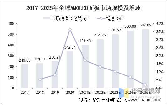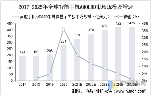2017-2025年全球智能手机AMOLED市场规模及增速