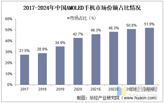 随着屏下摄像头、屏下指纹解锁技术逐步成熟,手机端OLED面板的渗透率也将进一步提升。从中国AMOLED手机市场份额占比来看,据统计,中国AMOLED手机市场份额从2017年27.5%上升至2020年的42.7%,预计2024年将达到51.9%。
