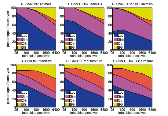 与使用方向梯度直方图(HOG)特征的传统DPM(Deformable Part Models)方法相比,CNN在目标检测中的错误更多地是由于定位不佳,而不是由于与背景或其他对象类别的混淆。这表明CNN学习到的特征在区分不同对象类别方面更具辨别力。这种定位不佳的假阳性可能是由于使用自下而上的区域提议方法和在预训练阶段学习到的对整个图像分类的位置不变性所导致的。