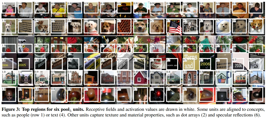 在网络中选择一个特定的单元,把它当作目标检测器来使用,也就是说在大量的闲置的区域提议上计算单元的激活值,将区域提议按照最高激活到最低激活排序,执行非最大值抑制,显示得分最高的区域。