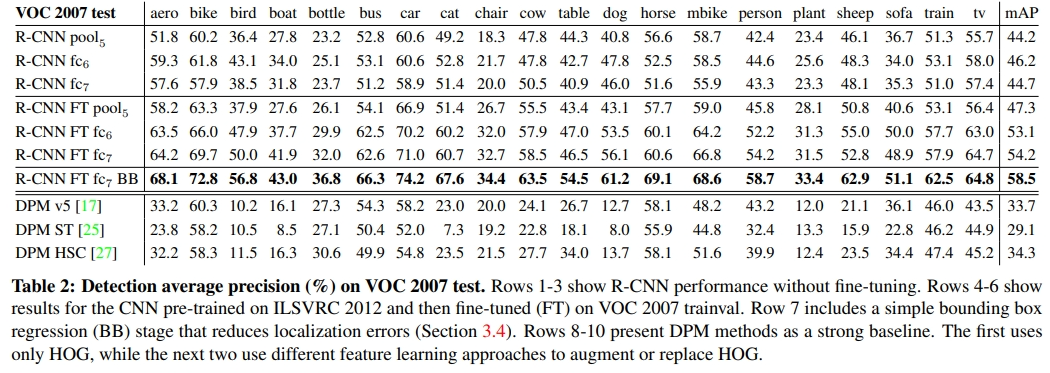 在比较中,R-CNN的所有变体在PASCAL VOC数据集上的性能都显著优于三种DPM基线方法,表明R-CNN在目标检测任务上的性能明显优于传统的DPM方法,即使是那些结合了高级特征学习方法的DPM变体也无法与之匹敌。这强调了深度学习方法,特别是CNN在特征表示和目标检测任务中的有效性和优越性。