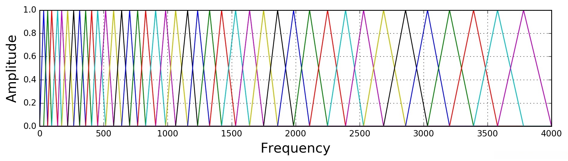 滤波器组中的每个滤波器都是三角形的,在中心频率处的响应为1,并朝着0线性减小,直到它到达两个相邻滤波器的中心频率处,响应为0,如下图所示: