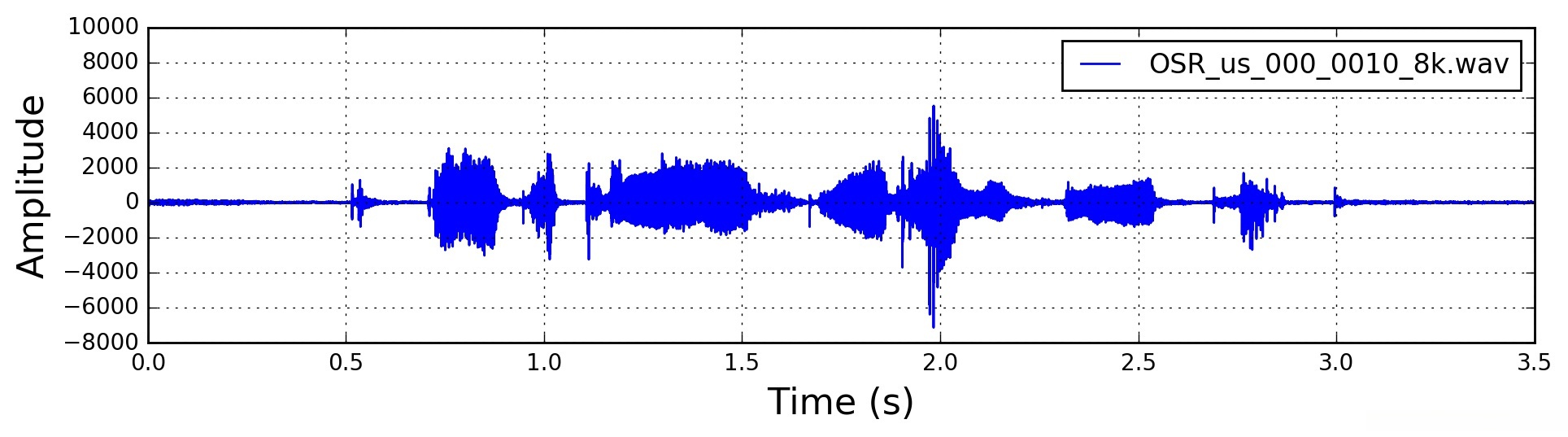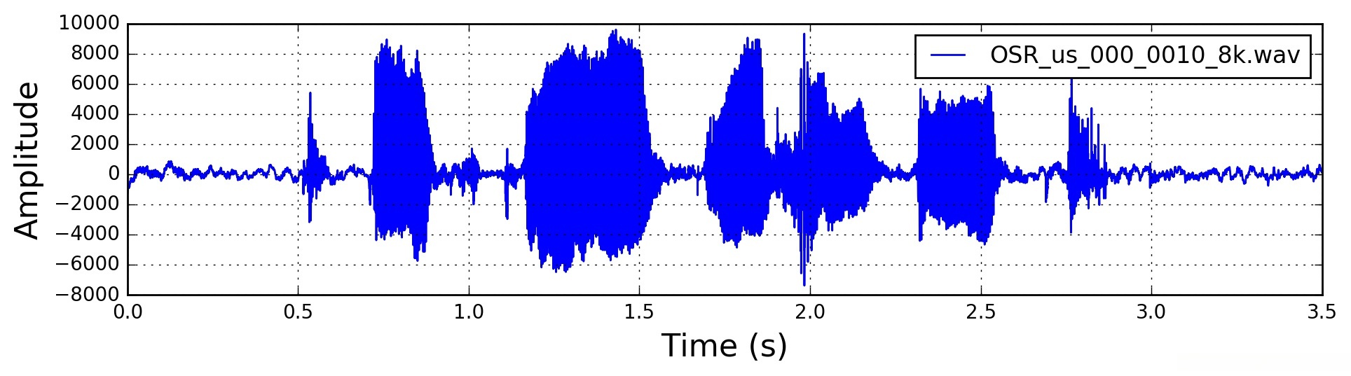 在本文中,我从此处使用了一个16位PCM wav文件,称为“ OSR_us_000_0010_8k.wav”,其采样频率为8000 Hz。 wav文件是干净的语音信号,包括单个语音,在其中说出一些句子,中间有一些停顿。 为简单起见,我使用了信号的前3.5秒,大致相当于wav文件中的第一句话。