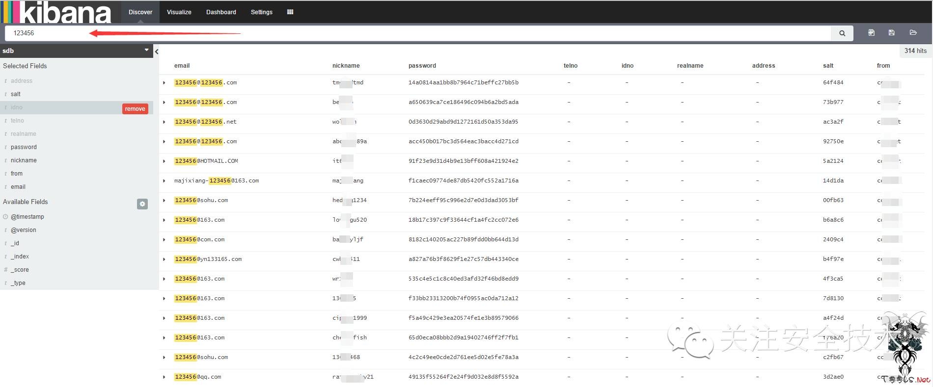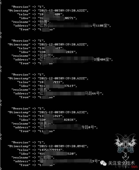 nickname(昵称)、password(密码)、email(邮箱)、qq(QQ号)、telno(手机号码)、idno(身份证号码)、 realname(真实姓名)、address(家庭住址)、salt(盐值)、from(数据来源)。相对来说我这样划分的还是蛮详细的。但是在用 Logstash写入ES的过程当中就比较费时了。其实如果想偷懒,完全可以把现有的数据只作为一个field写入,也是可以查询出来的。但是这样会比较 乱,看着很不舒服。