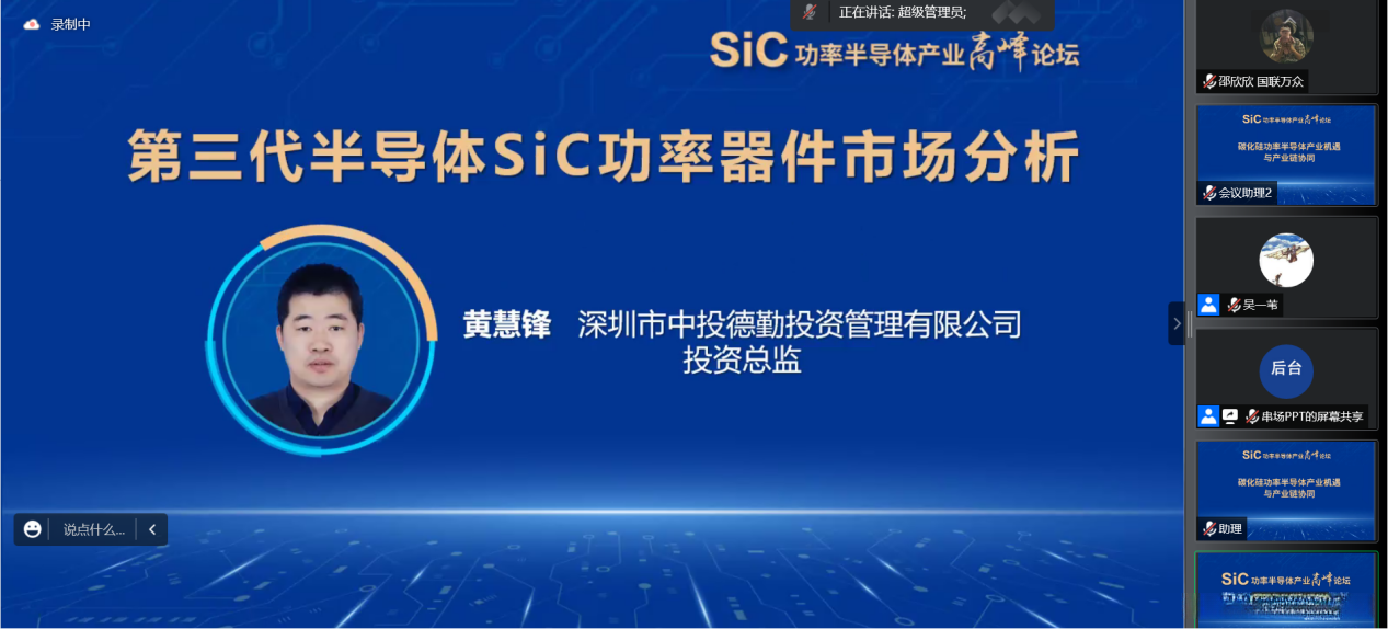 深圳市中投德勤投资管理有限公司投资总监黄慧锋在报告中讲到由于新能源汽车和储能的大规模商用,对功率密度和效率要求提升,在全球碳中和碳达峰的背景下,SiC会成为一种主流趋势;SiC还是欧美日本国际厂商英飞凌、ROHM、CREE、ST等公司技术和份额主导;国内SiC厂商发展迅速,外延和衬底国产化后价格还是持续走低;国内竞争对手众多,大家需要考虑整合资源协同发展;部分产品可以替代Si方案,当前难点还是驱动比较难需要方案级别替代;GaN技术在一定程度上可以替代部分SiC和Si的市场,需要技术创新和成本领先。