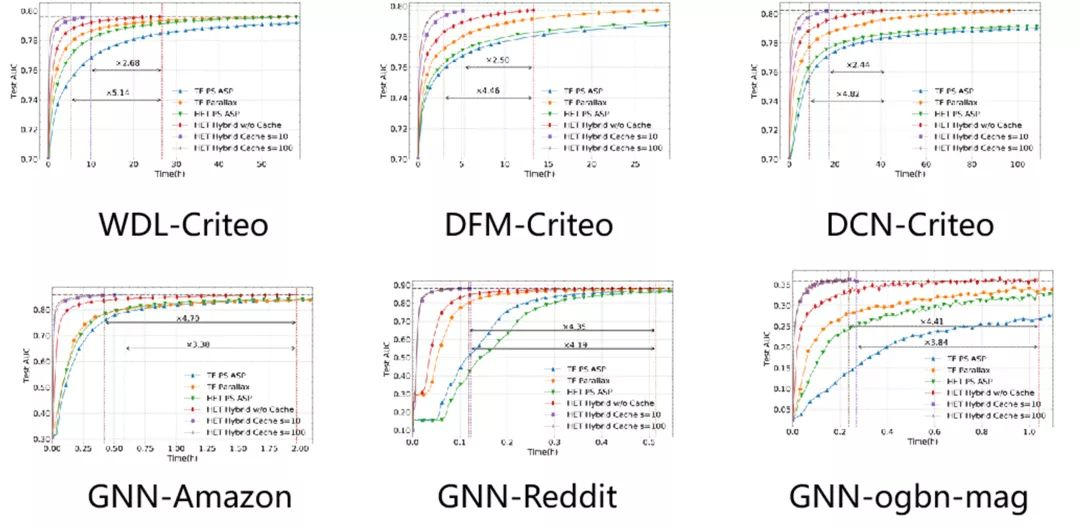 我们将HET和基于传统参数服务器架构的TensorFlow以及同样是参数服务器加全局规约的混合通信架构的Parallax[详见注解3]进行了对比,选取的数据集和模型包括:推荐模型Wide&Deep(WDL)、DeepFM(DFM)、Deep&Cross(DCN)和数据集Criteo,拥有三千多万稀疏特征,当Embedding维度扩大到4K时,模型参数可以达到万亿级别;以及图学习模型GraphSAGE和数据集Reddit、Amazon、ogbn-mag(OGB也是目前最权威的图学习基准数据集之一,Open Graph Benchmark)。