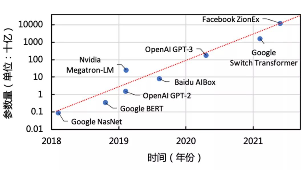 稀疏大模型,是目前重要的深度学习模型类型之一,广泛应用在搜索广告推荐、图表示学习等场景。近年来,随着数据规模的逐步增长,工业界稀疏大模型的规模日益庞大,参数量可以达到万亿规模。如图1所示,Facebook今年提出的ZionEX[详见注解1]系统所支持的推荐模型(DLRM)大小已经超过10万亿规模,远远超过了Google之前发布的1.6万亿参数的Switch Transformer[详见注解2]模型。