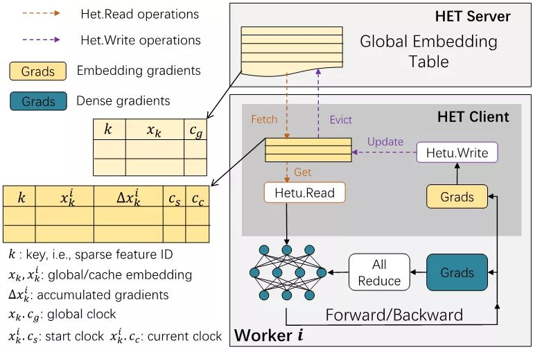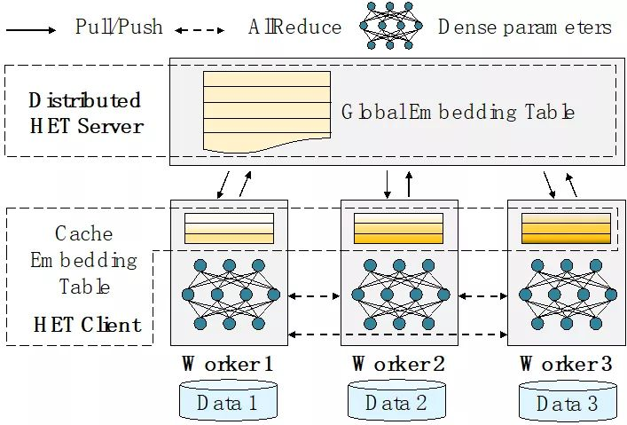 针对稀疏大模型参数中同时存在稀疏以及稠密部分的特点,HET整体上采用参数服务器(Parameter Server,PS)加全局规约(AllReduce)的混合通信架构,以充分发挥两者优势,如图3所示。其中AllReduce适合于稠密参数的同步,可借助NCCL等通信库充分发挥GPU间带宽,而参数服务器则天然支持稀疏通信,并且在同步协议上也具有较高的灵活性。同时,我们还在计算节点上设计了Cache Embedding Table结构,用于缓存高频访问的Embedding参数。