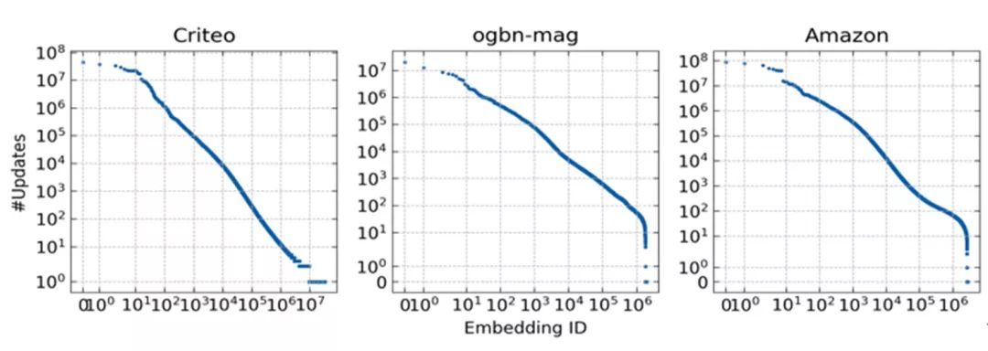 图2 三个常用公开数据集上的Embedding访问频率分布情况