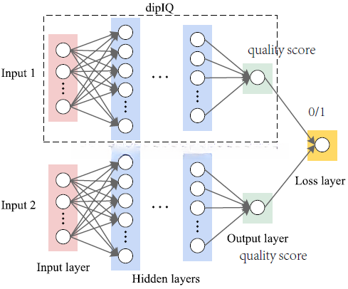 3.7 实验时,只考虑四个所用数据库中都存在的失真类型。论文只给出了一个全连接网络, 20000-256-128-3-1。每次给定DIP的时候,DIP中两张图像分别输入两个网络中(权重共享),可以得到一个测试值,反向传播时,Loss用的是两者的差异groundtruth(0/1),以及差异所所得的uncertainty值。