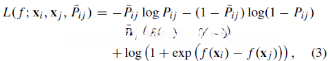 该函数表达式,其实就是Sigmoid函数。 (Pi,j)则可理解为image i质量比image j质量好的概率值。(Pi,j) 低于0.5,(Pi,j)表示j质量好的概率更大;(Pi,j) 大于0.5,表示i质量好的概率更大。所以,用交叉熵 来定义损失函数。