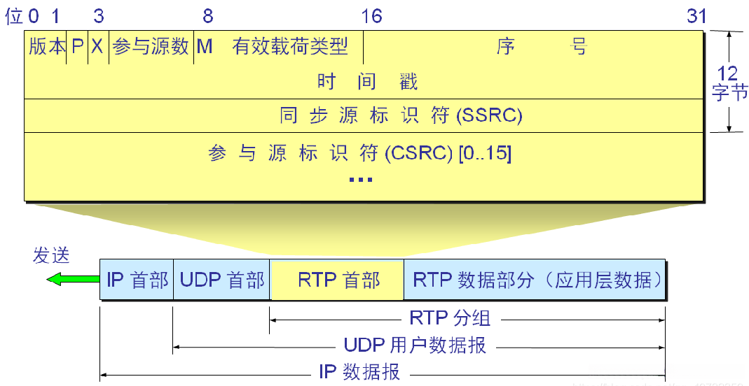 (10) 特约信源(CSRC)标识符:每个CSRC标识符占32位,可以有0~15个。每个CSRC标识了包含在该RTP报文有效载荷中的所有特约信源。具体数量由前面的CC决定。