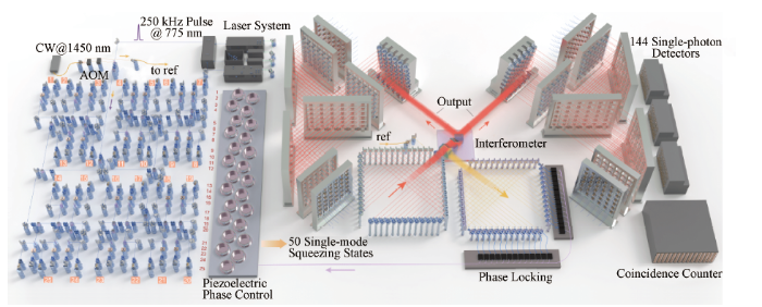 量子计算处理器硬件平台存在超导、光量子、离子阱、半导体、中性原子、拓扑、金刚石NV色心等主要技术路线。超导是目前发展较为迅速的路线,核心单元是“超导体-绝缘体-超导体”三层结构的约瑟夫森结电子器件,在量子操控与读取、退相干时间、可控耦合、可扩展性等方面有较大优势,但也存在低温屏蔽、宇宙射线干扰[15]等问题,目前国内外采用超导路线的企业与机构包括IBM、谷歌、中科大、本源等,主要成果包括谷歌53位“悬铃木”处理器、IBM 127量子比特处理器Eagle、中科大66量子比特“祖冲之二号”等。光量子具有室温大气环境可工作、量子态易操控等优势,同时存在光子间没有相互作用而造成双量子逻辑门难以实现等问题,PsiQuantum、Xanadu、上海交大、中科大等企业与高校正在开展相关研究,主要成果有中科大76位光量子比特原型机“九章”、113位光量子比特原型机“九章二号”(见图1)等[16]。离子阱实现原理是电荷与电磁场间的交互作用使带电粒子运动,同时利用受限离子的基态和激发态组成的两个内能级作为量子比特,利用微波激光照射操纵量子态,通过连续泵浦光和态相关荧光实现初始化与读取,优势在于消相干效应小、量子比特质量高、制备与读取效率高,短板是可扩展性差,Honeywell、IonQ、中科院、清华大学、启科量子等在进行离子阱研发,2022年Quantinuum宣布H1-2量子计算系统可达到4 096量子体积。量子点作为一种有着三维量子强束缚的半导体异质结构,将电子自旋等作为量子比特,使用微波脉冲或纯电学方式进行操控,优点是稳定性好、相干时间长、兼容性良好等,缺点在于量子纠缠数量少、易受环境影响,日本理化学研究所、中科大、本源等均在进行相关研究,2022年中科大实现硅基自旋量子比特的超快操控[17]。中性原子是近几年的后起之秀,原理是在超高真空腔中利用远失谐光偶极阱阵列或光晶格从磁光阱或玻色爱因斯坦凝聚体中捕获并囚禁超冷的原子形成单原子阵列,将原子基态超精细能级的两个磁子能级编码为一个二能级量子态(量子比特),研究者包括ColdQuanta、Atom Computing、哈佛大学、麻省理工学院等,2021年ColdQuanta推出100+量子比特处理器Hilbert,Atom Computing推出量子系统Phoenix,2022年哈佛大学展示289量子比特中性原子量子处理器在解决实际使用问题方面的应用。