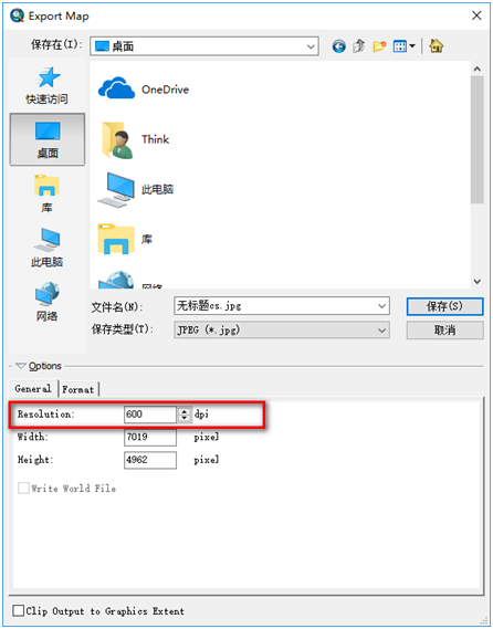 当所有工作都做完之后,接下来就是输出地图了,在File菜单下,单击Export Map,出现输出地图对话框,见图19,在此界面可以设置保存路径、保存格式及地图分辨率等,一般大于300dpi就可以了,看个人习惯!