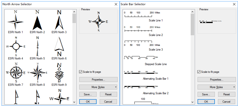 单击菜单“Insert——North Arrow”,选择合适的指北针,点击OK就可以将指北针添加到制图区域;或者Insert——Scale bar,选择合适的比例尺,点击OK即可。