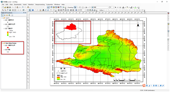单击菜单“Insert——Data Frame”,添加数据框到制图模块,右键添加数据,此时我们就可以把新疆或者中国矢量边界数据添加进来,之后再将制图所用的矢量数据边界添加到该Data Frame中(图18左侧红色框),设置好显示的颜色等信息,即可。