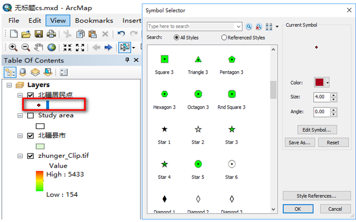 双击左侧图层列表中红色框内的渲染图符号,如图2左;出现如图2右,在弹出的图符号设置的对话框内,可以选择图符号的样式、大小、颜色等信息;