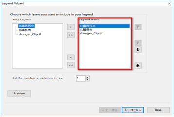单击菜单“Insert——Legend”,见图9,这一步你可以设置需要显示的图例,默认全选,如果不希望显示某些图层的信息,可以在红色框内选择图层,单击中间“<”按钮,将选择的图层移除到左侧Map Layers就可以了。在此,提醒一下,如果需要显示的图例较多,可以在下面Set the number of columns in your 设置以多列形式显示;